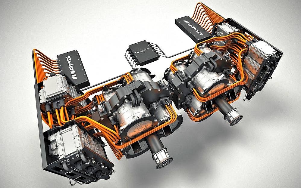The power train, however, is all Mercedes. The Top Gun's main electronic components including the electric motors, power electronics, high voltage batteries, and AMG Powertrain Controller (APC) were ported wholesale from the AMG SLS Coupe. On land, the AMG SLS is powered by a quartet of electric motors with a combined output of 740 HP and 727 foot-pounds of torque. The Top Gun, however, packs triple the number of engines under its hood. A total of twelve 185 HP compact permanent-magnet synchronous electric motors are arranged into a pair of 6-engine clusters, each driving one of the boat's propeller shaft.